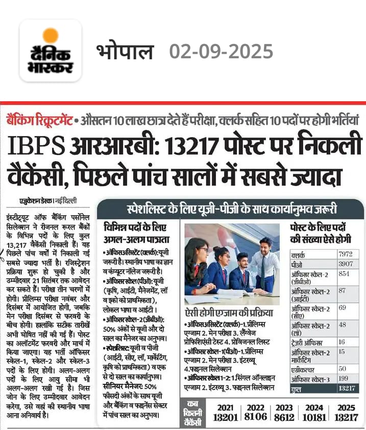 Bhopal, 02 September 2025 – बैंकिंग सेक्टर में नौकरी की तैयारी कर रहे युवाओं के लिए बड़ी खुशखबरी है। इंस्टिट्यूट ऑफ बैंकिंग पर्सनल सिलेक्शन (IBPS) ने रीजनल रूरल बैंक्स (RRBs) में विभिन्न पदों पर भर्ती के लिए कुल 13,217 पदों की वैकेंसी जारी की है। यह संख्या पिछले पाँच वर्षों में निकली भर्ती में सबसे ज्यादा है।